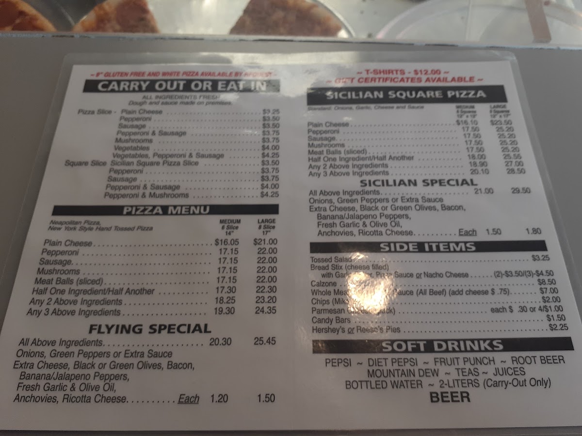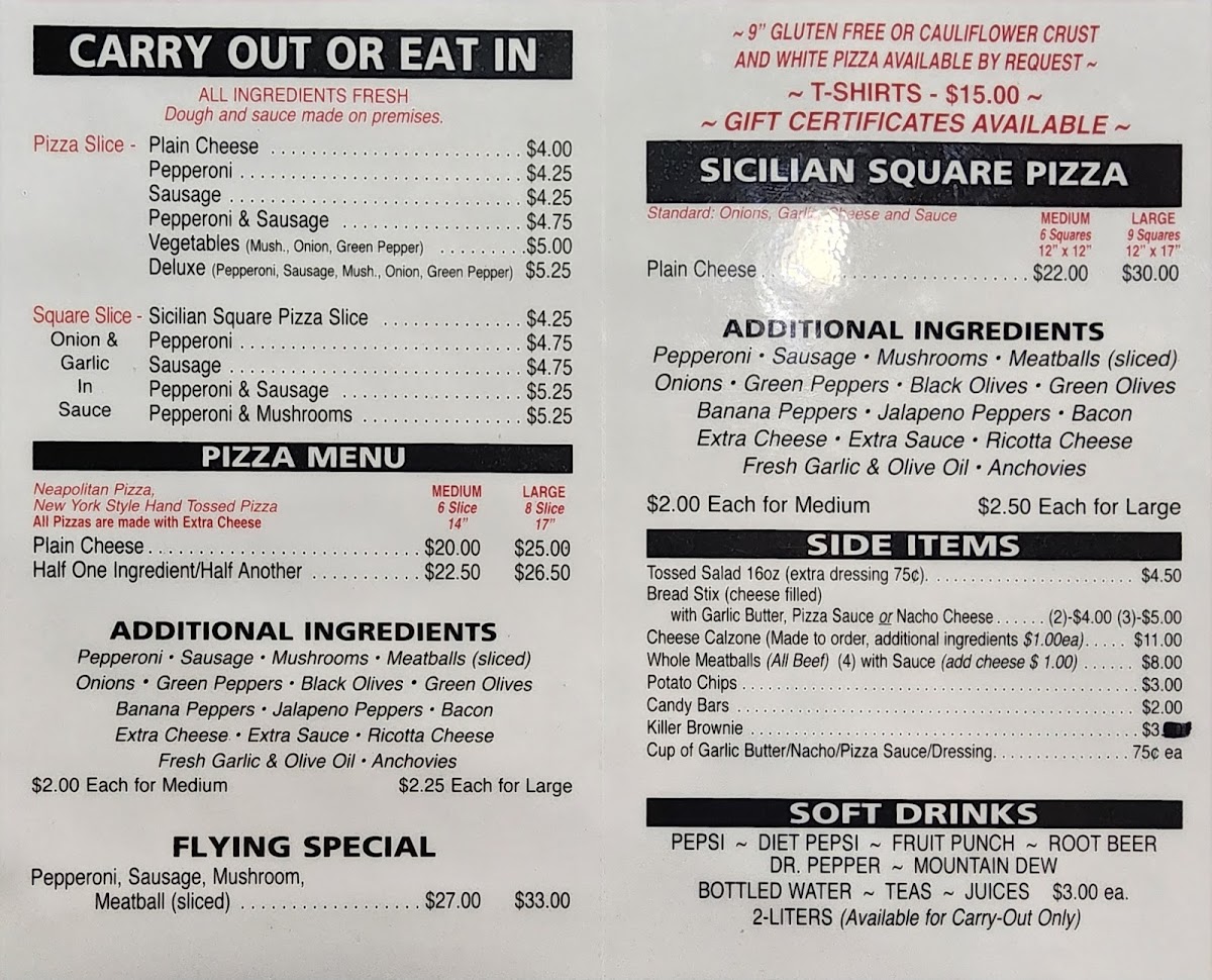 Located at 223 N Main St, Dayton, Flying Pizza offers an authentic taste of New York-style pies that captivates both locals and visitors. Their menu celebrates classic pizzas by the slice, with options like Plain Cheese for just $2.50, and Pepperoni or Sausage slices for $2.75. For those looking to customize, a Flying Special lets you add extra ingredients like jalapeño peppers and ricotta cheese, ensuring a delightful twist.